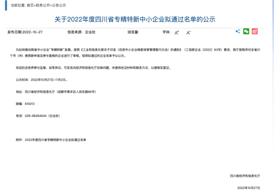 10月27日,四川省经信厅,为加快推动四川省中小企业“专精特新”发展,按照《工业和信息化部关于印发〈优质中小企业梯度培育管理暂行办法〉的通知》要求,四川省经信厅发布了2022年度四川省“专精特新”中小企业拟通过名单,共有1424家企业入围。